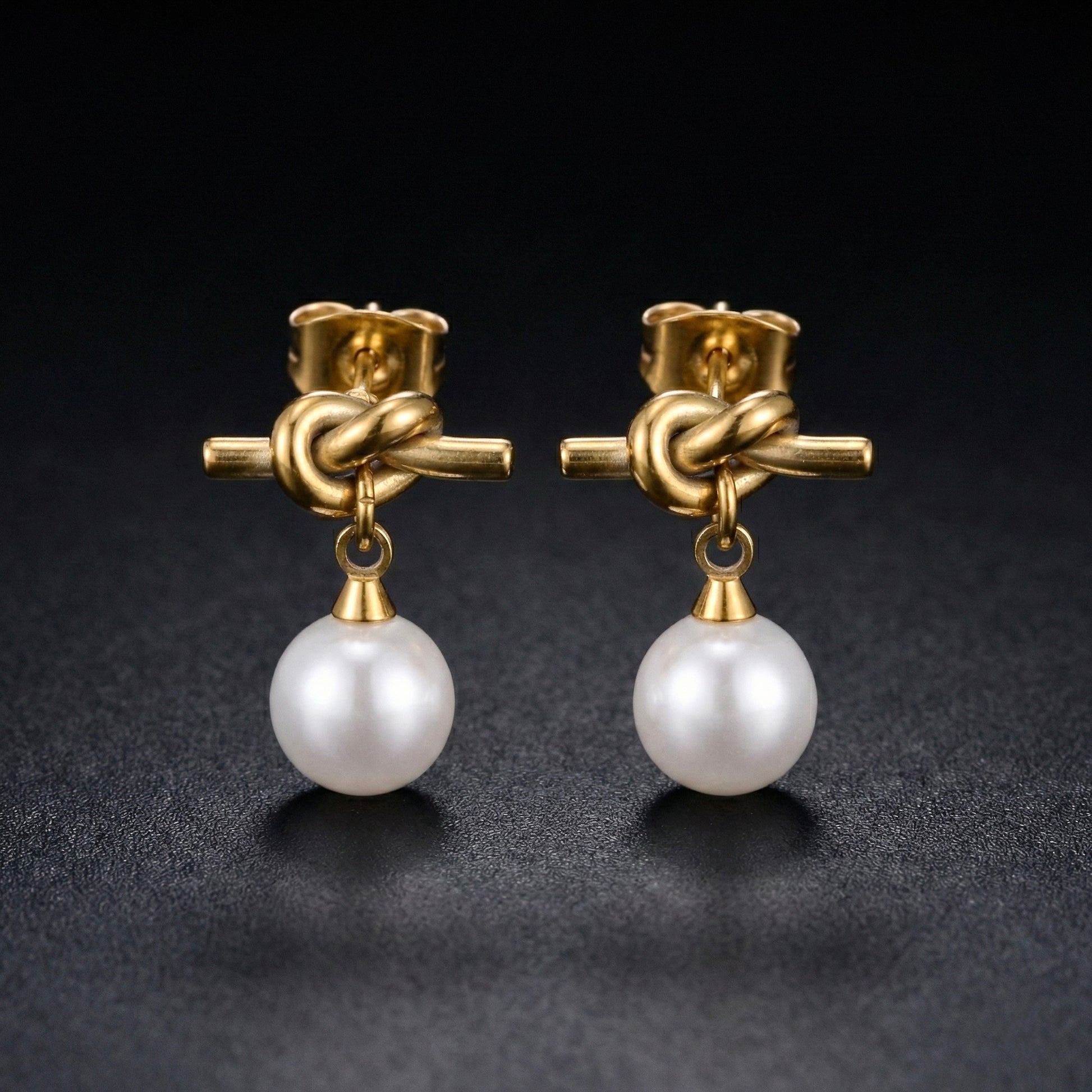 Modern gold knot earrings with a luminous pearl drop. A minimal yet elegant design for everyday wear and special occasions.