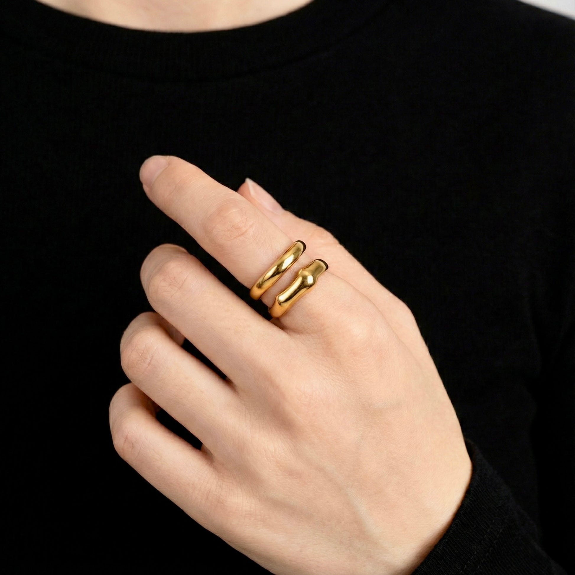 Make a confident statement with the Solyn Bold Ring. Featuring a fluid, sculptural silhouette with a mirror-like shine, this 18k gold-plated ring embodies bold minimalism with effortless elegance.